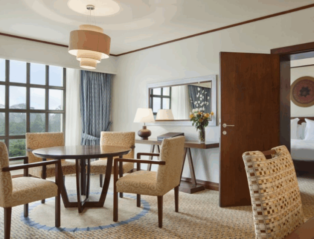 Guests enjoy a wide range of facilities including a 25-meter pool, fitness center with sauna and massages, multiple dining options, 24-hour room service, car rental, free airport transfers, and secure parking. The hotel also features event halls and a large green lawn for conferences or special occasions, all within a lush garden setting and high-security environment. Perfectly situated near major Oil and Gas, and government offices, Bisila Palace combines comfort, convenience, and professional service.